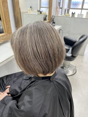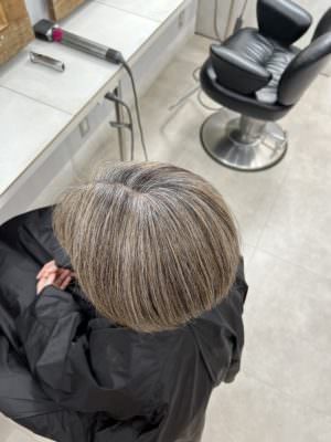 染めきるのではなく、淡めに染める事で時間経過で発生する根元プリンを防ぎ、デザイン性のあるグレイヘアに移行していくメニューです。