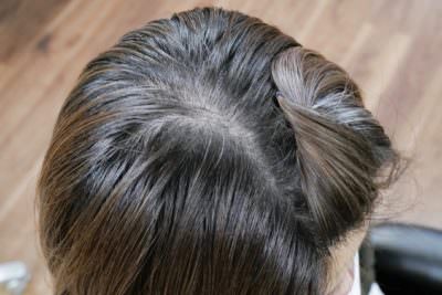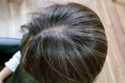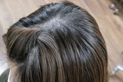 全体的には10%位の白髪が点在していますが、左頭頂部の直径4-5cmの固まり白髪があるのが特徴で、ベースカラーが明るめでも暗めでも、1ヶ月以内に白髪と黒髪両方に対してのプリンが気になるという悩みがありました。